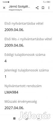 Egyéb információ: azonnal elvihető - garantált km futás - garázsban tartott - keveset futott - nem dohányzó - törzskönyv - vezetett szervizkönyv