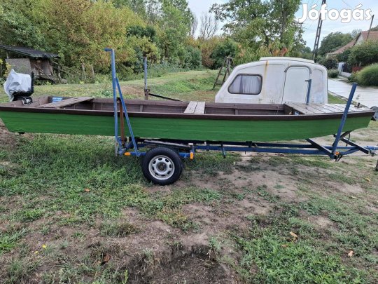 Eladó egy Polar Craft Dakota V1460 motorcsónak kompletten. A motor 3 éves új állapotú ( az üzemidejéről a fényképen). Az utánfutón érvényes műszaki van . A csónak anyaga Almg3 duraluminium, a tömege mindössze 66kg. A motor 42kg ezért szinte bárhol vízre rakható a szett, akár sólyapálya nélkül is. Egy személlyel 36km/h óra sebességet eléri, erről csatoltam képet is.