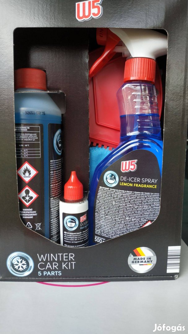 5 részes csomag dobozban. Jégkaparó, törlőkendő, zárolajzó-jégoldó, tömény fagyálló ablakmosó és -19 fokos jégoldó permetező flakonba.