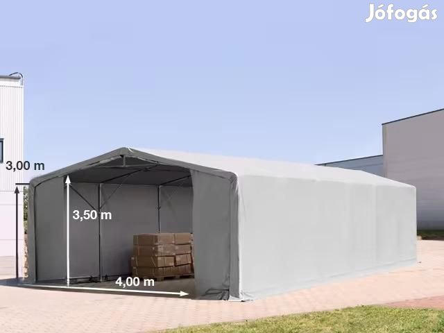 Professzionális egész évben használható raktársátor. A teljesen horganyzott acélszerkezet rögzítő alapkerettel és  tető megerősítéssel rendelkezik így ellenáll a szélnek,  időjárásnak. A ponyva kiváló minőségű,PVC-ből áll.  A ponyva extra erős a DIN EN ISO 527 szerint tanúsított. A PVC ponyvát magas időjárási és UV-állóság jellemzi, ezért rendkívül tartós. +50 és -30 ° C közötti hőállósággal, maximális UV-védelemmel és tűzvédelmi tanúsítással rendelkezik. Mérete: Szélesség:  8,00 m Hossz:12,00 m Oldalfal magasság: 3,00 m Gerincmagasság: 4,4m Bejárat 1.  mérete:  4,0 x 3,5 m Bejárat, kapu 2. mérete: 4,0 x 3,5 m Súly: 524 kg Bejárat: Cipzáras kapu Tartó szerkezet jellemzői: A teljesen horganyzott acélcsövek védelmet nyújtanak a korrózió és az időjárás ellen.