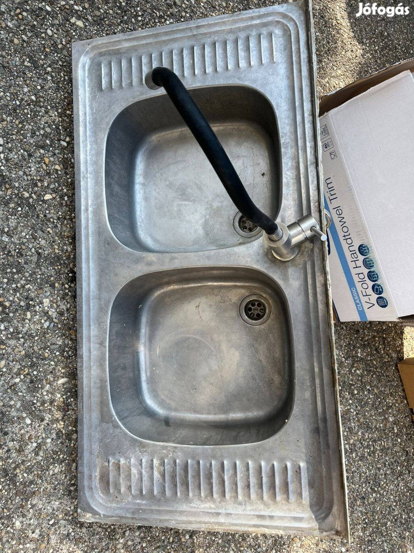 Ez a rozsdamentes acél mosogatótálca egy professzionális, magasított, hajlítható karú csapteleppel együtt eladó.