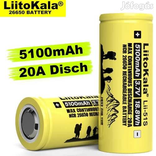 Liitokala Lii-51S Li-ion 3.7V 26650 5100mAh 20A (5447) (Kategória: Tölthető Elemek)<p>Liitokala Lii-51S Li-ion 3.7V 26650 5100mAh 20A