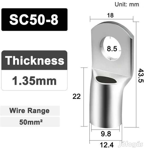 Préselhető Kábelsarú 50mm2-es Akkumulátor Kábelhez M8 (5638) (Kategória: Inverterek, Nagy Akkumulátorok)<p>Préselhető, vagy forrasztható Nikkelezett Vörösréz Kábelsarú