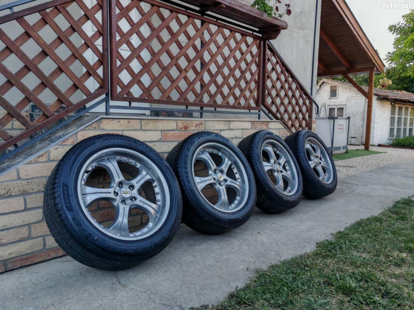 Eladó ATS német gyártmányú 19"-os alufelni garnitúra. 5x108 lyukosztás, 8J, et45, közép furat 72,6 mm de jelenleg 63,3 mm-es központosító van benne (Ford Kugán volt,de a fotón látható további márkához is jó osztókörmódosító nélkül). Gumik Bridgestone Dueler 235/55-R19 nyári, négy egyforma, dot2520 mindegyik. Kettő 90%-os, a másik kettő nagyjából még 80%.