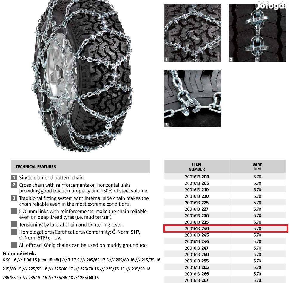 Megerősített 5,50 mm-es láncszemek: hóláncot megbízhatóvá teszi még mély futófelülettel rendelkező gumiabroncsokon esetén is (pl. sáros terepen).