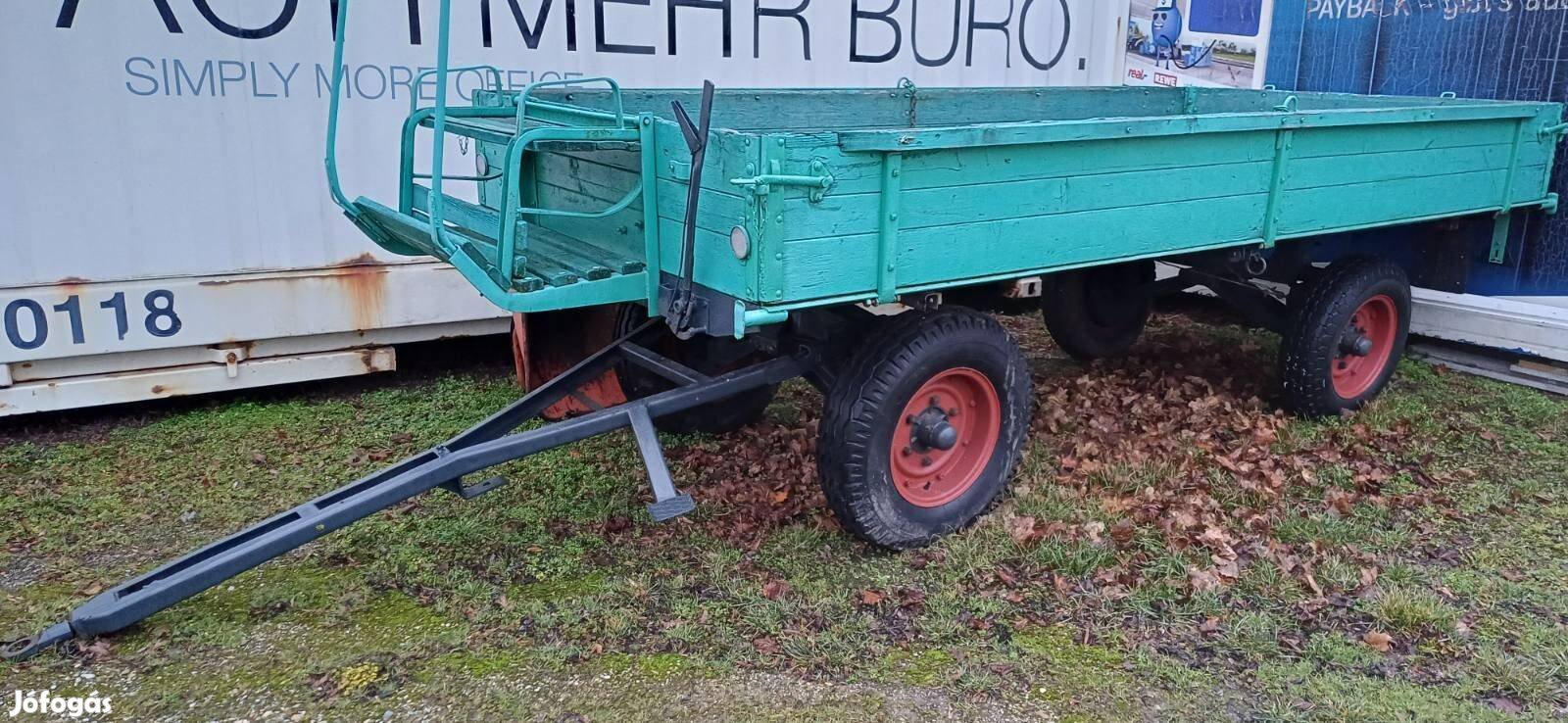 Eladó egy 3T-ás 2 tengelyes forgózsámolyos, 4 lengőkaros, erős, jó állapotú Palten-Sthalindustrie, 1955-ös pótkocsi, papirok nélkül. Azonnal munkára fogható.
