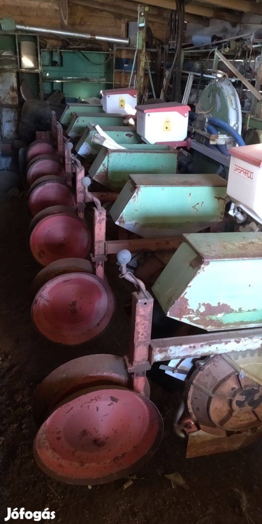 Eladó 6 soros Hassia szemenkénti vetőgép. Mikrogranulátum szóróval, kukorica és napraforgó tárcsákkal.