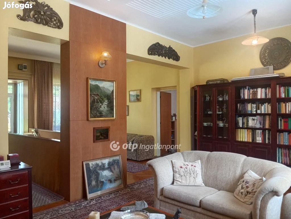 A tégla szerkezetű különleges elrendezésű kétszintes ház 1977-ben épült újjá, belső tereit egyedi tervek alapján alakították ki. Az alsó szintre - ahol a tágas előtérből 1 szoba, 1 tároló, 1 fürdőszoba, és a lépcsőfeljáró nyílik - közvetlenül az utcáról lépünk be, így bármilyen iroda, orvosi rendelő, üzlet, vagy akár önálló garzonlakás szerepét is betöltheti. Az emeleti kertkapcsolatos lakrészbe - ahol 2 szoba, 1 tágas nappali-társalgó, 1 étkező, 1 konyha, 1 kamra, 1 fürdőszoba, 1 WC és 1 gardróbszoba kapott helyet - tölgyfalépcső vezet fel az előtérből. A belső burkolatok - parketta, padlószőnyeg, járólap, csempe -, és a nyílászárók megkíméltek, az eredeti állapotokat tükrözik, igény szerint felújítandóak. A műanyagból készült hőszigetelt üveggel ellátott ablakokra reluxát szereltek fel, a belső tereket natúr lakkozott tölgy ajtók választják el egymástól, az udvarra méretes üvegajtón át jutunk ki. Az otthon melegéről radiátoros hőleadással cirkós gázkazán gondoskodik, az épület szigetelésére, energetikai korszerűsítésére nem került sor; a meleg vizet villanybojler adja.
