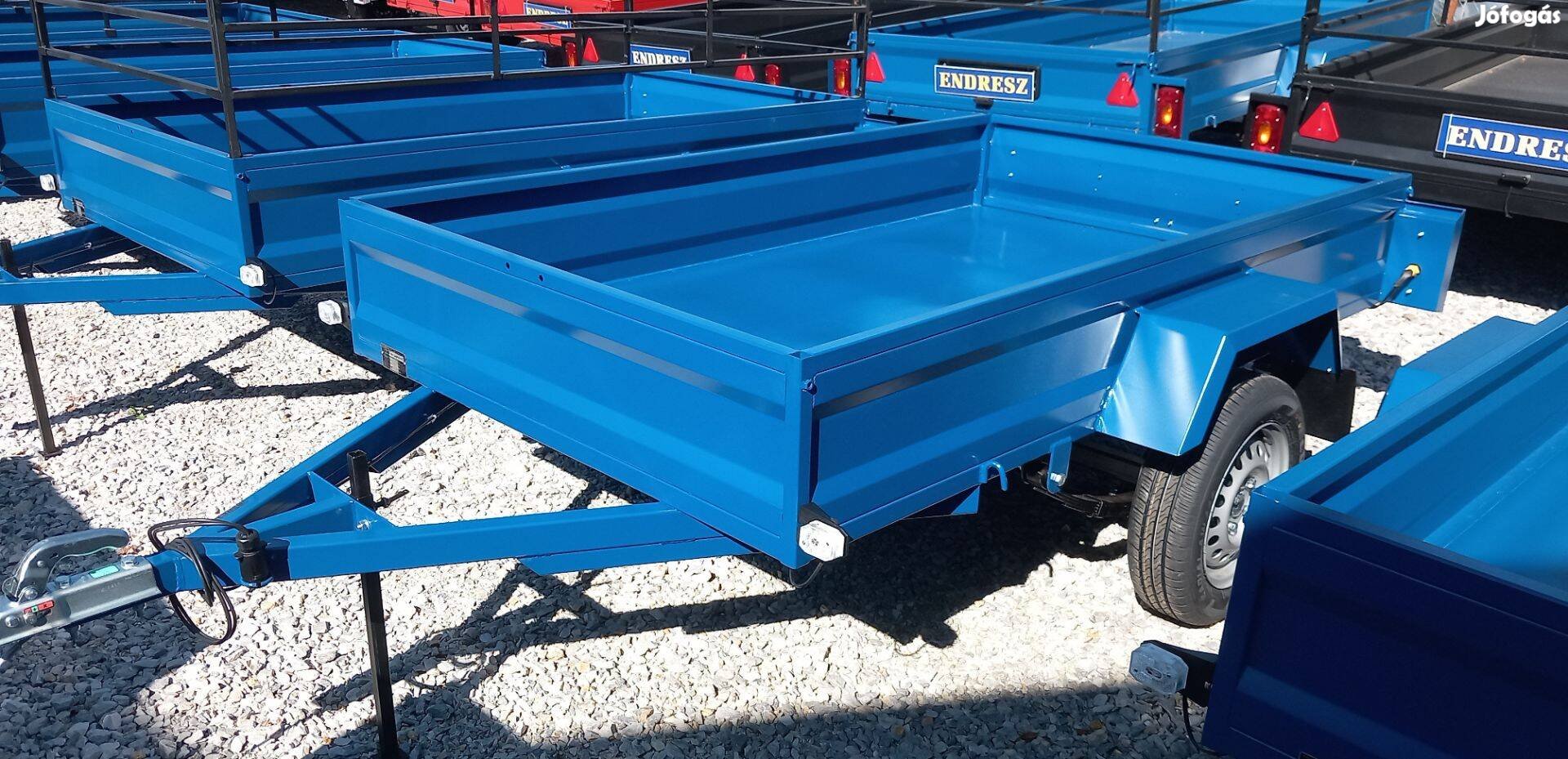 Eladó a képeken látható teljesen új, egytengelyes, festett, kék színű, erős, masszív, hegesztett, 750kg-os tengellyel szerelt, laprugós + teleszkópos változat, 130 x 220 x 32 cm-es féknélküli utánfutó, 750kg összsúlyra vizsgáztatva.