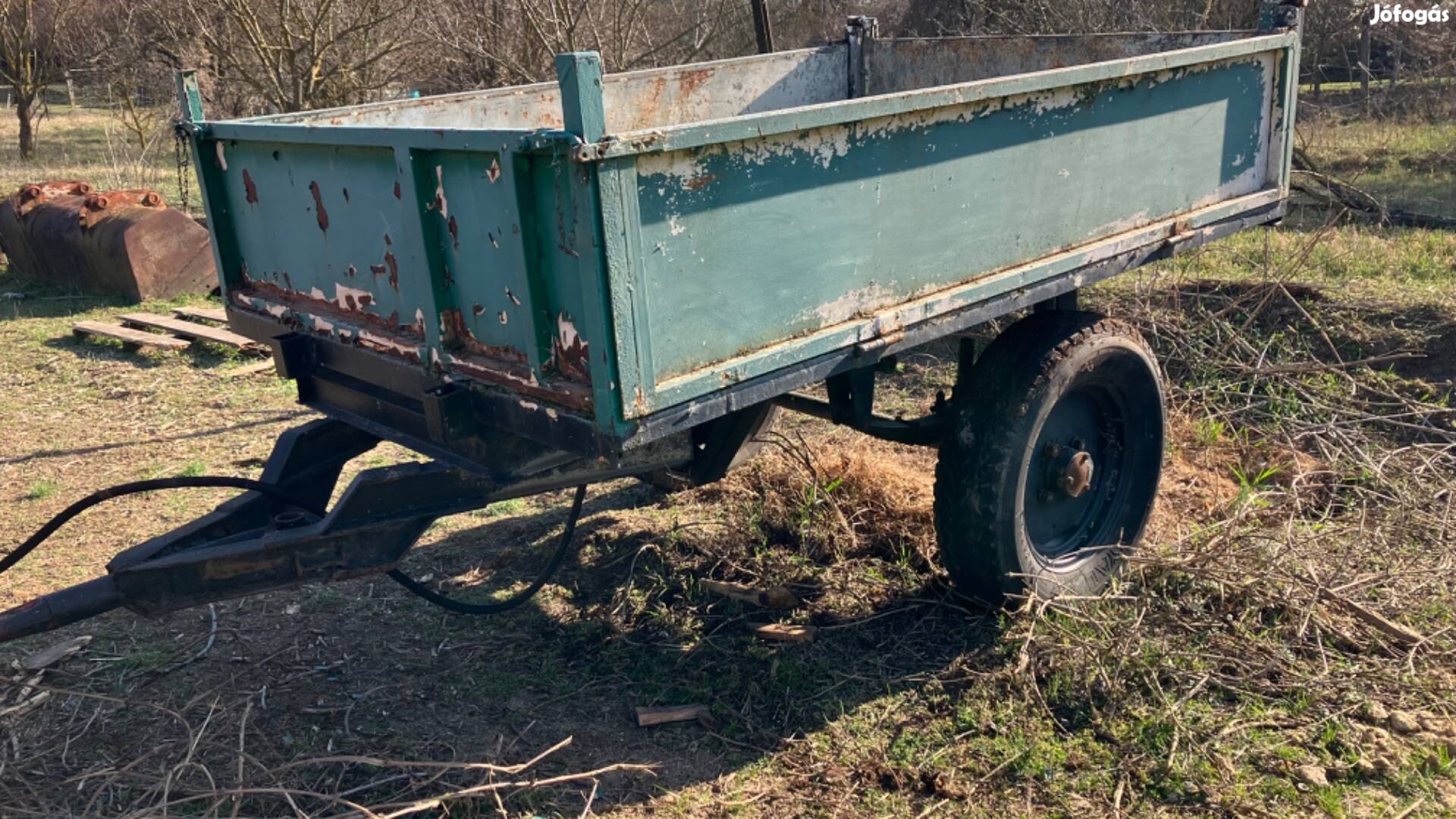 Traktor pótkocsi eladó! Billenő plató mérete:140x210cm. Billentő hidraulika hibátlan! Hátrafelé billent! Papírja nincs. 1-1.5tonnát vidáman elvisz és billent! Ha bálba menne egy festés elkélne!