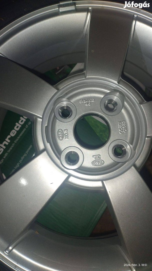 Eladó 5 db gyári KIA felni (RIO JB) R15, 4x100, ET46. 4 darab Nexen 195/55 nyári gumival szerelt, jó állapotú (6+mm profil), DOT: 2023 47.hét. Az 5. pótkerék volt, a gumi sosem használt, de 20 éves (értéktelen). A felniken használat nyomai látszanak, a pótkerék sértetlen. Egyben eladó.