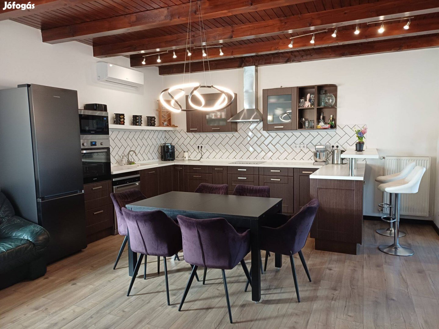 A konyhanappaliban kezelt látszó gerendás fafödém és hajópadló borítás teszi igazán egyedivé a teret.