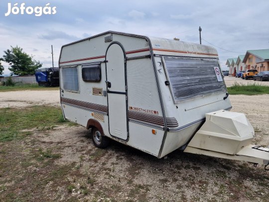 Egyik oldalt 2 fekhelyes hálo mely jelenleg fix - másik oldalt körüléses nappali mely 3 személyes fekhely is lehet - középen egyik oldalt gardrob fűtés es konyha- másik oldalt fürdő - 1986 évjárat - 2,2m szélesség - 5,35m lakrészhossz - 7m teljes hosszal - 190cm belmagasság -1200 kg önsúly - összsúly - egy ablaka pótolt a többi ép - sehol nem ázik be - vonófeje jó - adásvételi szerződéssel - 699.000 Ft-os irányáron eladó.