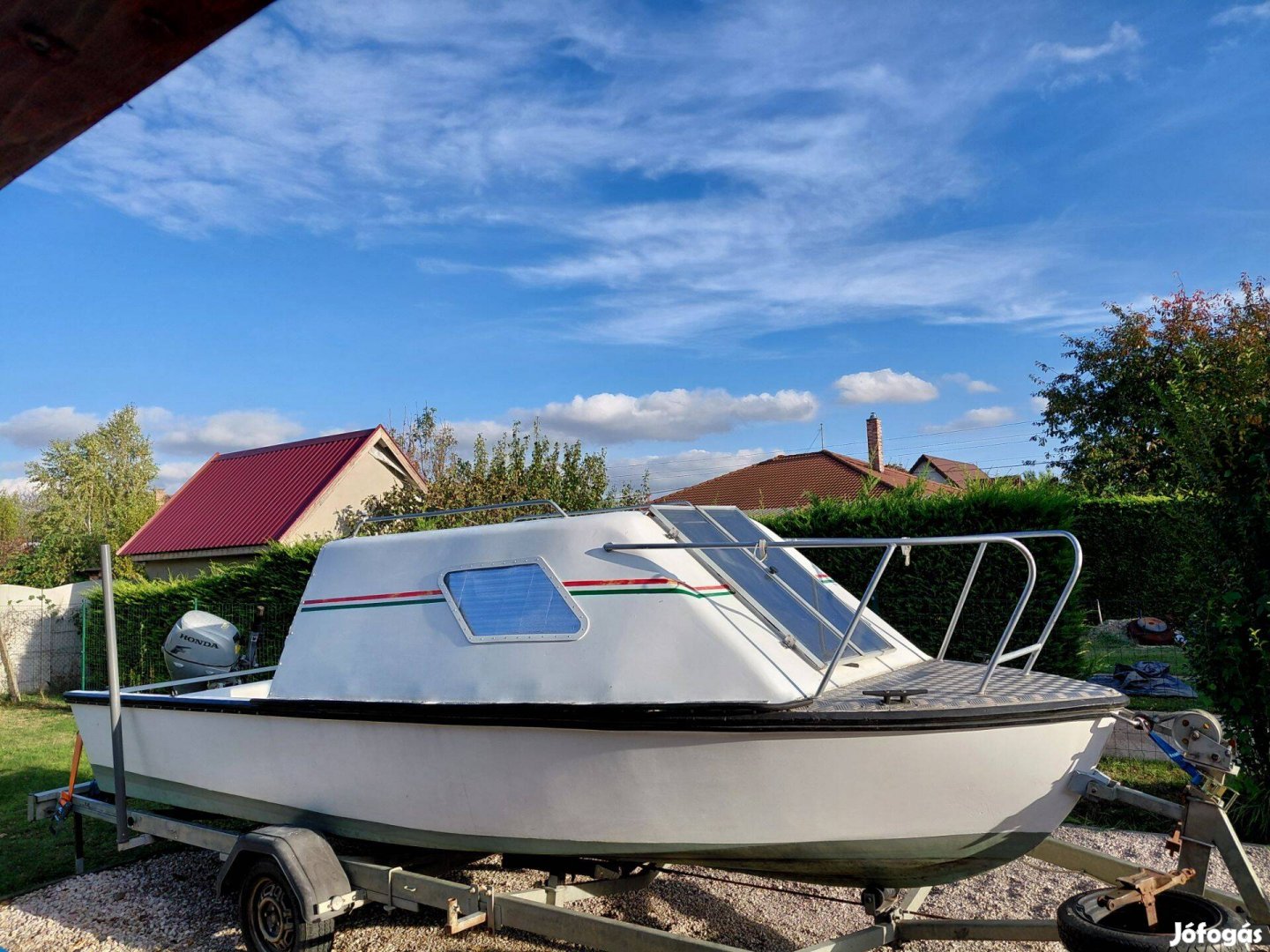 5.5m hosszú 2m széles kishajó 10Les- Honda motorral papíros utánfutóval eladó!
