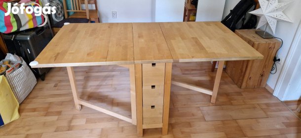 Ikea-s asztal, pontos nevét nem tudjuk, Ingatorphoz hasonló, viszont ez masszív, tömör fa asztal. 110 cm átmérőjű, ami bővíthető 150 cm szélességig. A székek frissen tisztítva.