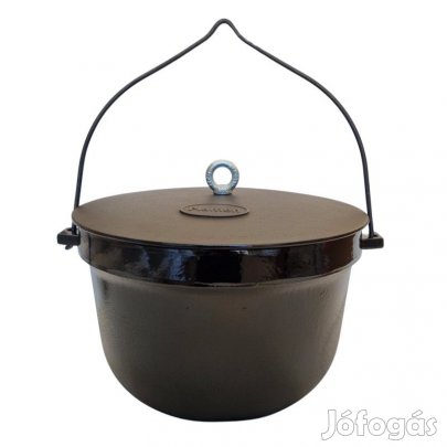 Kétrészes zománcozott öntöttvas serpenyő fedővel kb 26 cm átmérőjű, 10 cm hosszú a nyele, 42 cm a teljes hossza, 8 cm magas fedő nélkül, 12 cm magas fedővel