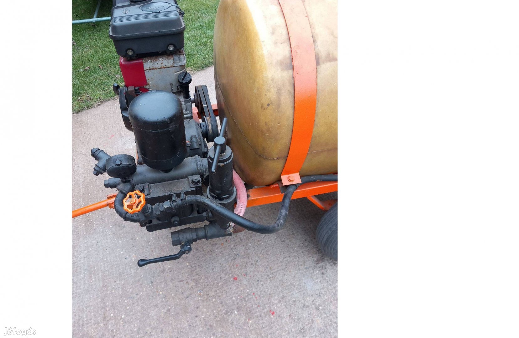 A képen látható gép eladó.Jól működik 220 literes tartály 20m tömlő és szórófej tartozik hozzá.Önálló 6.5 le motor dugattyús szivattyú.