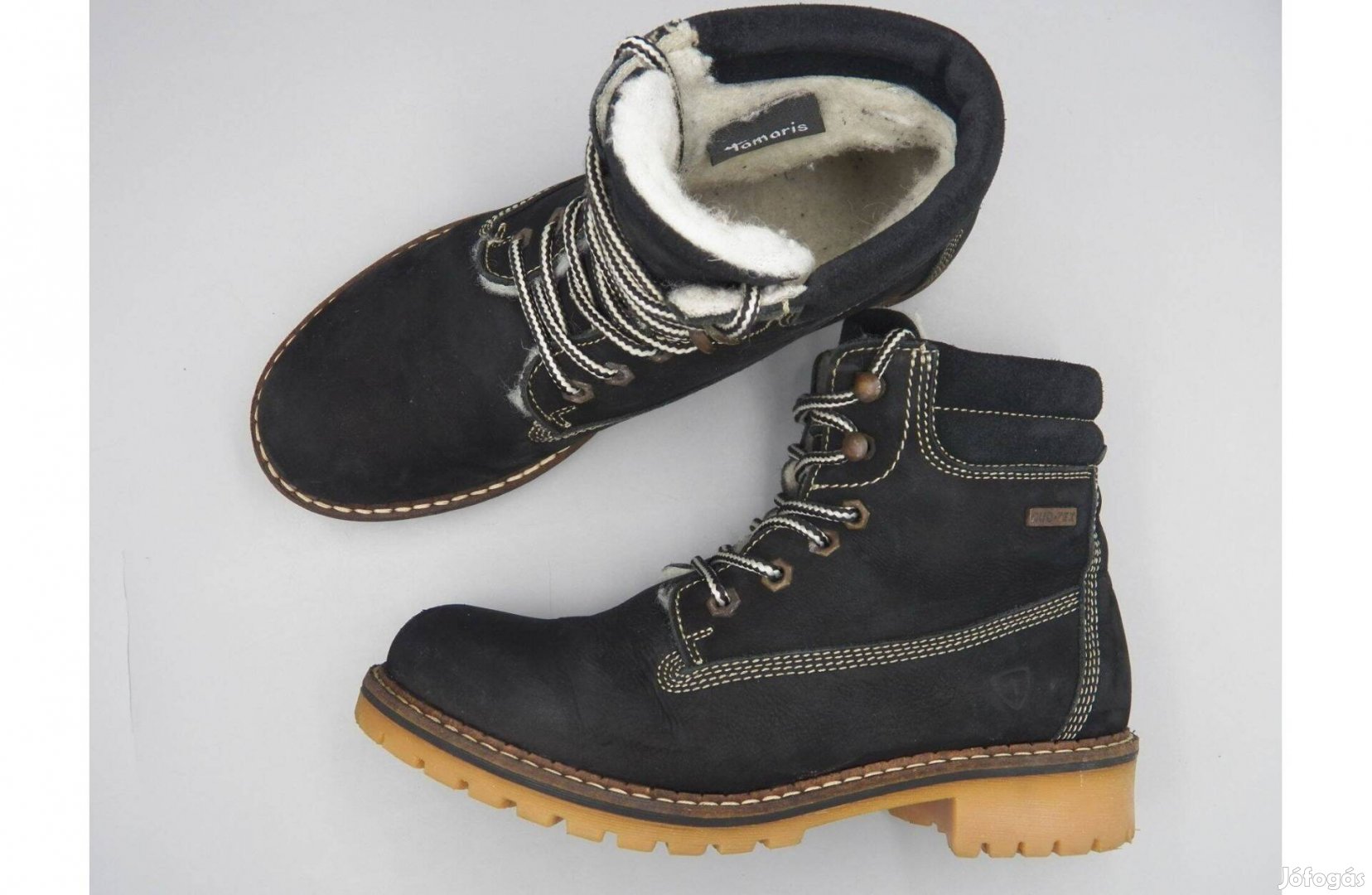 Keveset használt, jó állapotú Tamaris Duo-texes (víztaszító) bundás bélésű nubuk bőr bakancs. Fekete színű.