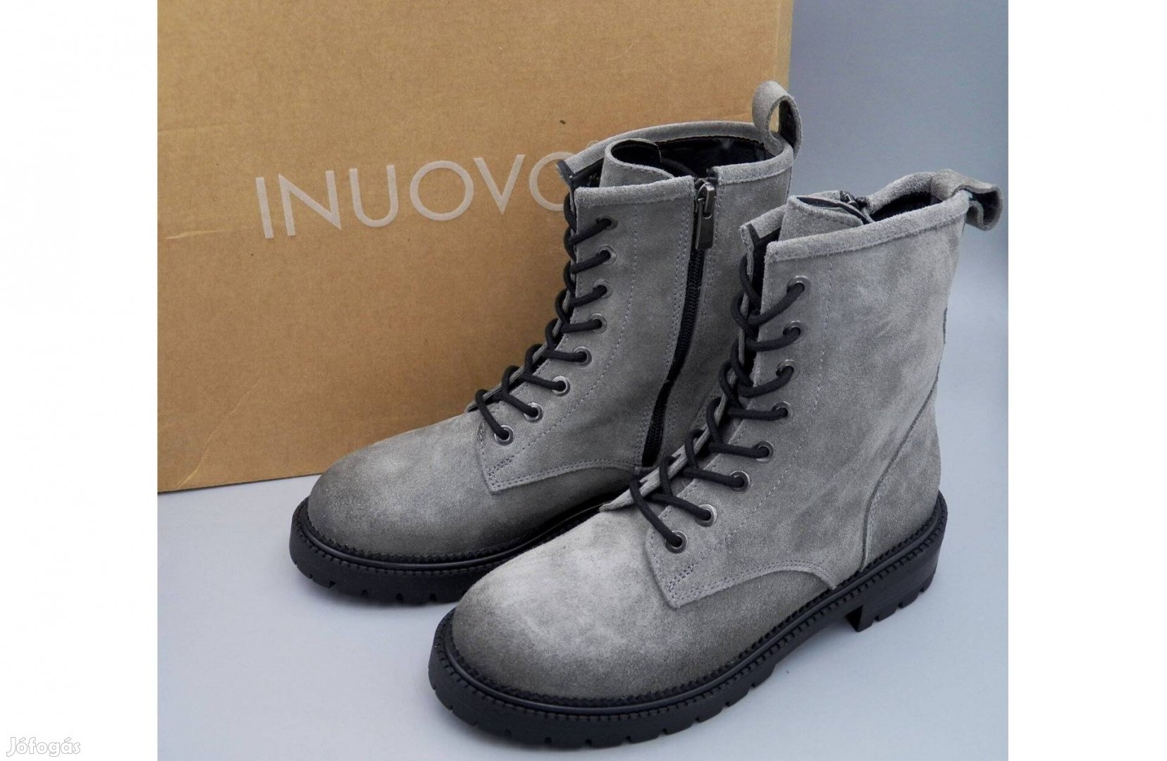 Vadonatúj állapotú Inuovo velúrbőr szürke bakancs saját dobozával. Bélése nem túl vastag textil anyag. Cipzáros-fűzős fazonú.