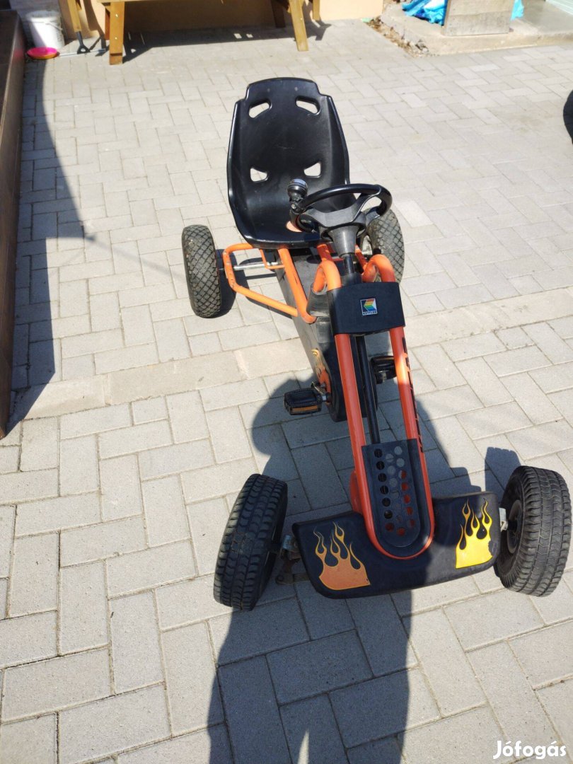 Eladó a képeken látható Kettler típusú pedálos go-kart. Erős stabil váz, hajtás és fúvott gumikerekek. Nem csörgő-zörgő műanyag kordé. 6-tól akár 14 éves korig használható. Ülés távolsága állítható a pedáloktól. Előre és hátramenetben is kontrás hajtás és fék. Jár hozzá 2db külső és belső gumi . Érdeklődni telefonon lehet.