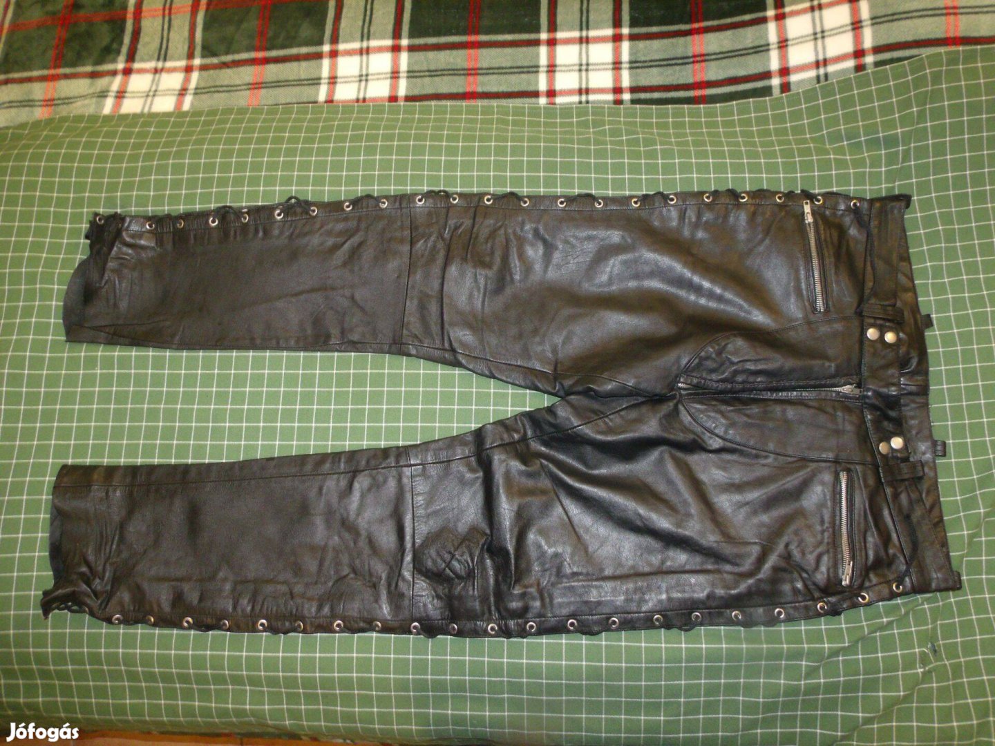 Eladó a képeken látható bőrnadrág. Keveset használt, jó állapotban van. Vékony bőrből készült, kényelmes viselet. Az oldalán a fűző textilből van, nem bőr, de természetesen ki lehet cserélni. Az elején a slicc körül az íves rész valószínűleg utólag lett beletoldva, a cippzár alatti varrás fura, azt külön fotóztam.
