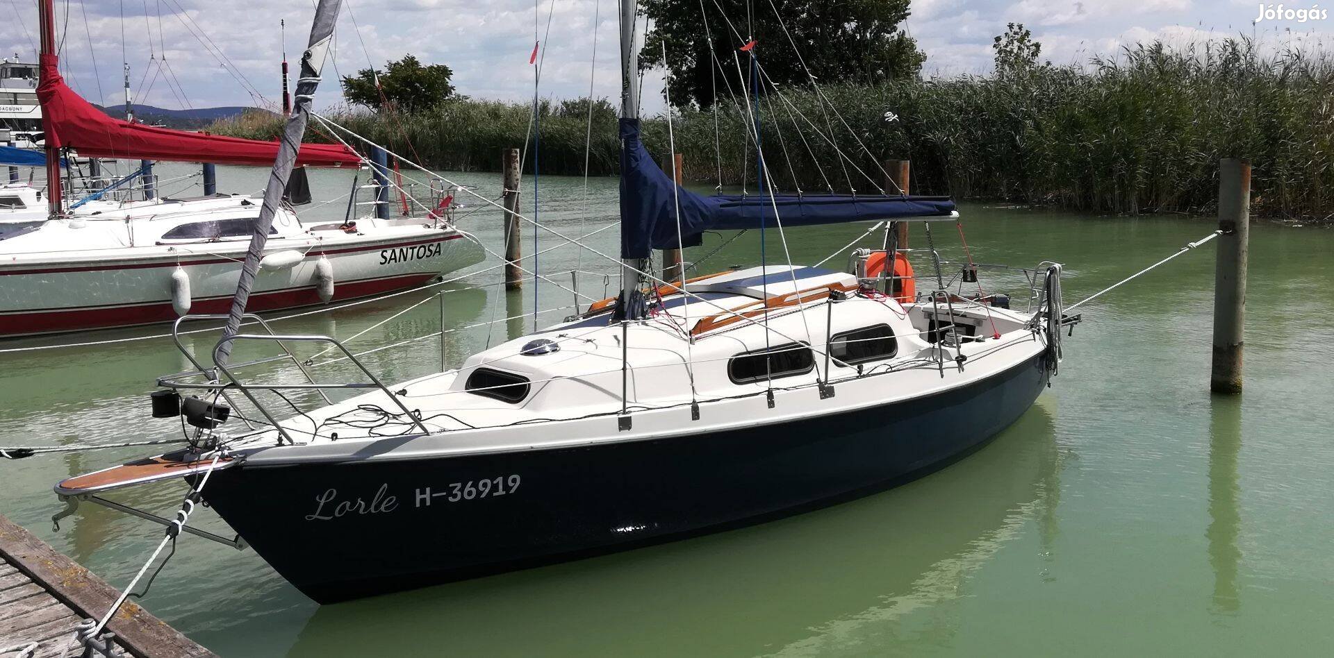 Eladó Neptun 22 típusú, 22 lábas kielsvertes családi túravitorlásunk, magyar rendszámos közúti trailerrel. A nyugat-német gyártmányú hajó a családi túrák megbízható igáslova, rengeteg tárolóhellyel és könnyű kezelhetőséggel. Utánfutóján középkategóriás gépkocsival is könnyedén szállítható, így akár külföldi nyaralásokra is kiválóan alkalmas lehet. Merülése felhúzott sverttel csak 55 cm, ugyanakkor a 315 kg tőkesúly beerősödő szélben is jó kezelhetőséget és biztonságérzetet ad. A 8 lóerős, kétütemű Mariner külmotor nem a fartükrön, hanem az achterládában lévő motorházban kapott helyet, ezért hullámosabb vízen is megbízhatóan működik. Vitorlák: Diekow grósz + fock1 (UV csíkkal) + Genua.
